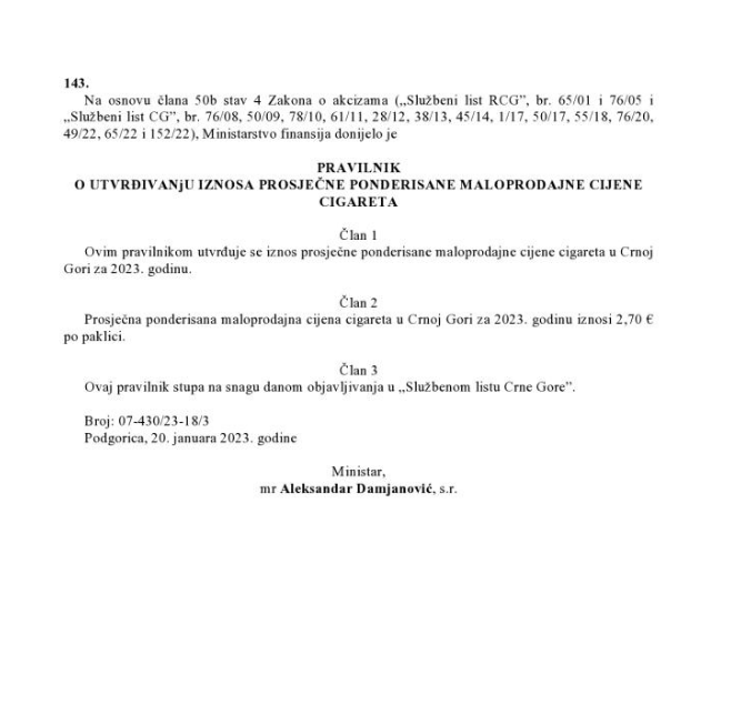 - Pravilnik o utvrđivanju iznosa prosječne ponderisane maloprodajne cijene cigareta ("Sl. list CG", br.9/23)